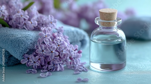 lilac, flower, blooming, blossom, essential oil, bottle, glasses, cork, clear, liquid, towel, soft, blue, spa, treatment, wellness, aromatherapy, relaxation, therapy, fragrance, perfume, health, hygiene, spring, closeup, still life, studio shot, indoor, beauty, cosmetic, health care, alternative medicine, natural, calm, peaceful, bodycare, skincare, lifestyle, well-being