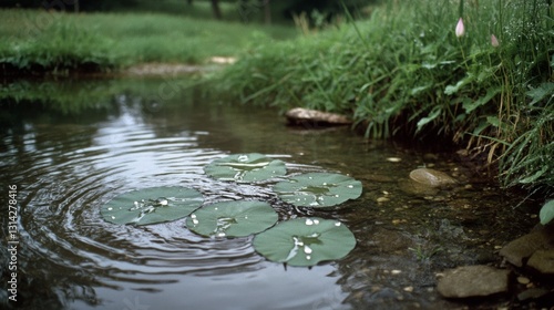 Lily pads with raindrops on a tranquil pond surrounded by lush greenery, capturing a serene, natural moment.