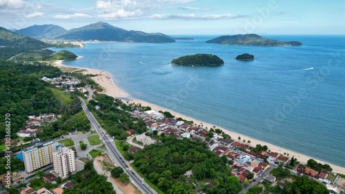 Linda vista aerea com drone sobre o mar com montanhas e cidade ao fundo com cores vibrantes.