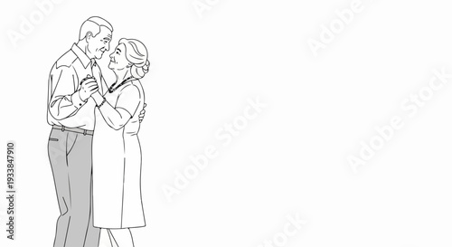 Line art illustration depicts senior couple dancing gracefully, expressing love and connection. Elegant older couple dancing together, celebrating enduring romance and shared happiness.