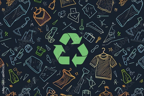 Line art pattern include a recycle symbol, shirts, pants and clothing hangers Generative Ai