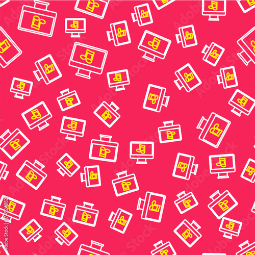 Line Computer with music note symbol on screen icon isolated seamless pattern on red background. Vector