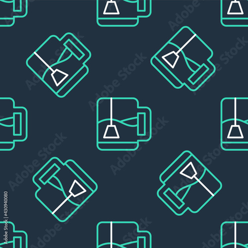 Line Cup of tea with tea bag icon isolated seamless pattern on black background. Vector