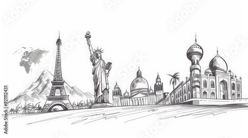 line drawing of famous world landmarks