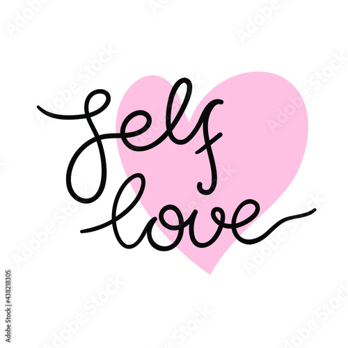Line drawing text - self love. With pink heart. Minimalist vector lettering isolated on white background for banner, sticker, print, embroidery, etc.