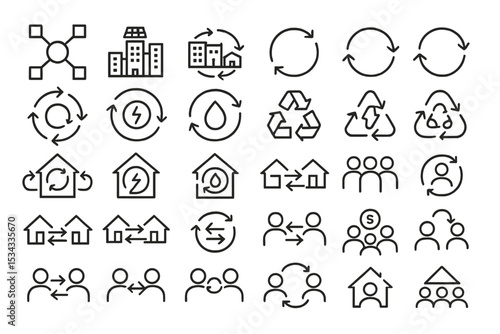 Line icon set representing circular economy, energy sharing, and sustainable communities