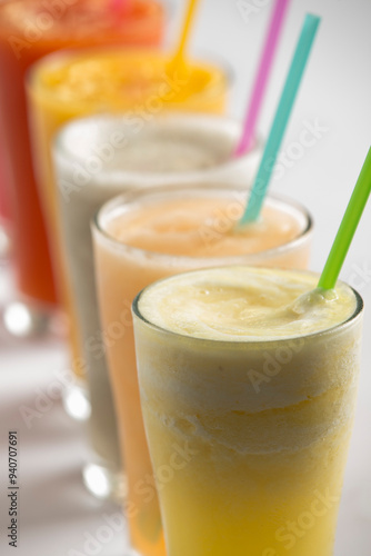 line of cold colorful variety of fruits smoothies in glasses with straws menu shoot