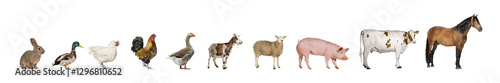animal, farm, white background, farm animal, group, mammal, bird, poultry, agriculture, farming, food, rural, nature, isolated, standing, half face, full-length, profile, looking away, domestic, hen, chicken, rooster, duck, goose, rabbit, goat, sheep, pig, cow, horse, brown, white, black