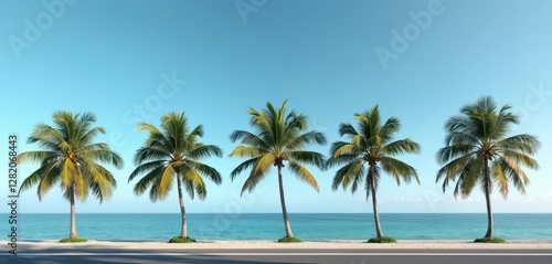 Line of palm trees alongside the road under bright blue sky and turquoise sea water. Coastal scenery offers a serene view of tropical island. Summer vacation background with coconut trees and highway.