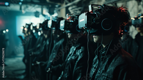 Line of People Wearing VR Headsets in a Dark, Futuristic Environment