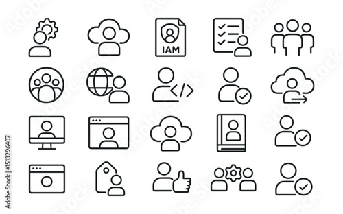 Line style icons of users and cloud roles: admin user, cloud user profile, IAM policy icon, user permission list, team role icon, access group, remote user, developer role, guest user, login cloud,