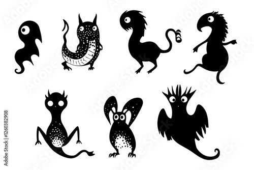cute, monster, set, funny, vector, silhouette, silhouette, animal, cartoon, illustration, animal, black, icon, halloween, collection, design, wild, pet, art, pet, symbol, drawing, signs
