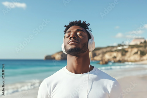 beach, ocean, wave, sky, sun, sand, earphones, music, wireless, listening, peaceful, relaxed, joyful, happy, fresh air, calm, outdoors, mindfulness, leisure, travel, adventure, lifestyle, vacation, freedom, modern, trendy, casual attire, stylish, portrait, young, black man, meditation, calmness, inspiration, scenic, sea, horizon, energy, summer, confidence, connection
