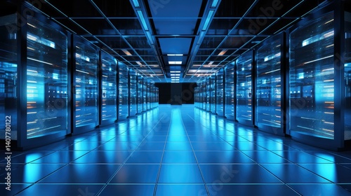 lit, datum, center, room, illustration, dimly, blue, ambient, lighting, image, atmospheric, experiencing, dim, cool, glow, server, rack, parallel, row, led, light, futuristic, ambience, floor, raised, cooling, cable, management, technician, headset