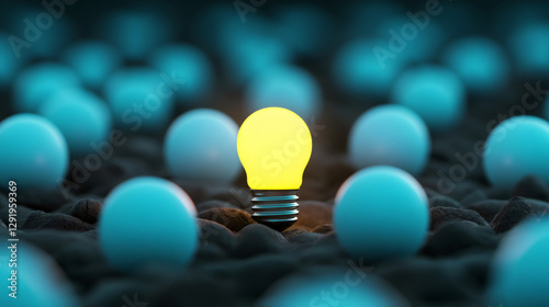 Lit light bulb surrounded by unlit blue spheres, concept of new ideas, innovation, and standing out from the competition