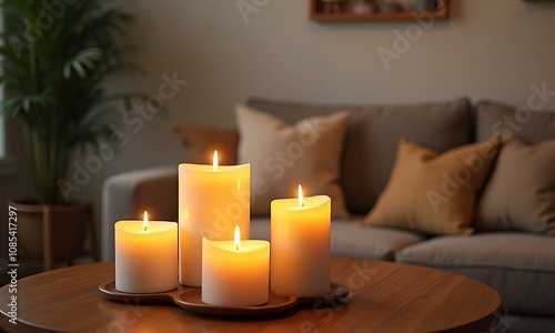 Lit pillar candles on table in cozy living room.
