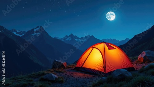 Lit up tent with stars and moon shining bright in mountains at night, landscape, stars, atmosphere