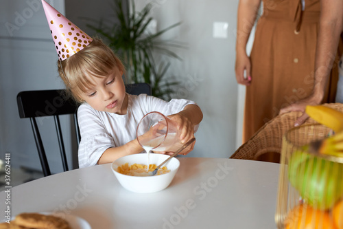 little adorable child girl pours milk into a bowl of cereal, caucasian girl in party hat in the morning of her birthday