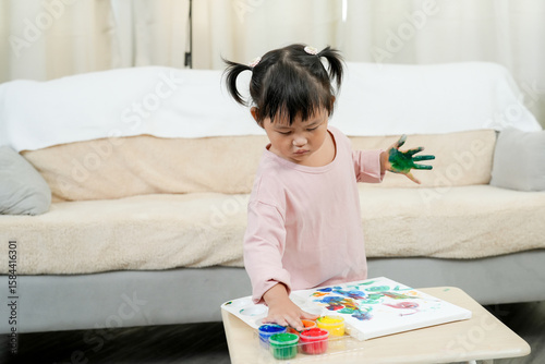 Little Asian girl wearing pink shirt painting colorful creative pictures using fingers on white paper smiling standing next to table in cozy bright home early childhood artistic education