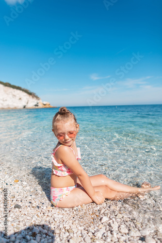 Little beautiful child girl with pink sunglasses in a fashionable swimsuit sits and rest on the beach near the blue clear sea on the island of Elba
