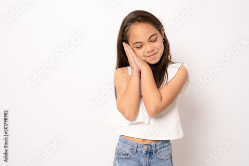 Little beautiful girl isolated on white background making sleep gesture.