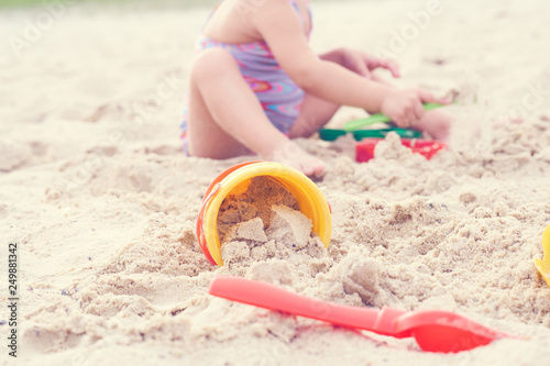 Little blonde baby girl playing with sand on the beach using plastic toys.