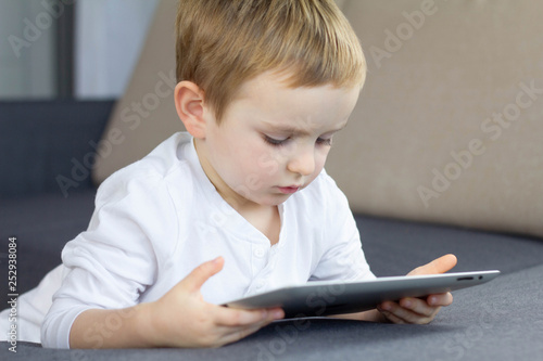 Little blonde boy using touchscreen tablet at home. Happy smart child watching tutorials or playing game on tablet computer. Education, technology, children's security and fun concept.