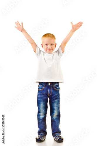 boy, isolated, white, little, children, background, children, portrait, happy, cute, young, standing, smile, childhood, male, happiness, people, caucasian, person, beautiful, face, smiling, studio, joy, cheerful, fashion, human, photogenic, 1, fun, youth, casual attire, small, joyful, adorable, emotion, laughing, lifestyle, t-shirt, jean, hand, up