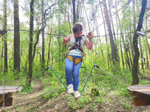 Little Caucasian blond girl plays in the park or forest, rope park in outdoors. Summer sports children's activity and playing. Local vacation and tourism concept, the new normal reality covid-19