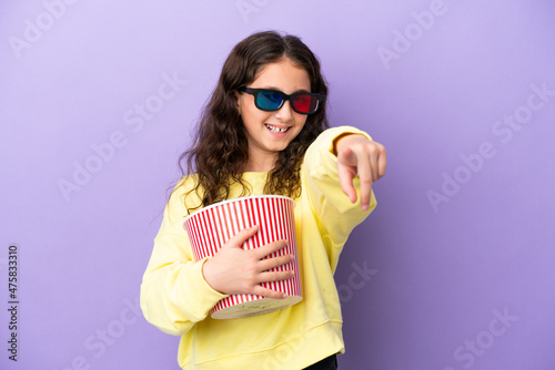 Little caucasian girl isolated on purple background with 3d glasses and holding a big bucket of popcorns while pointing away