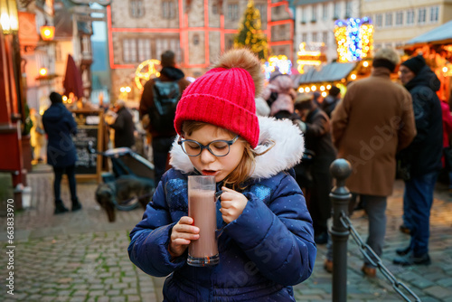 Little cute preschool girl drinking hot children punch or chocolate on German Christmas market. Happy child on traditional family market in Germany, Laughing kid in colorful winter clothes