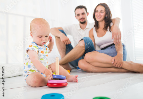 Little cute six-month-old baby collects a pyramid on the background of blurry laughing parents. Concept child care and children's health