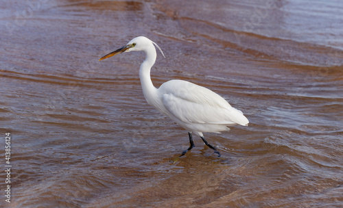 Little egret (Egretta garzetta). The white bird hunts fish in the red Sea.