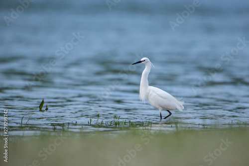 Little egret, in the water near the shore of the river