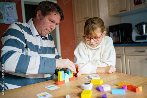 Little girl and her father playing wooden blocks parlor game at home.
