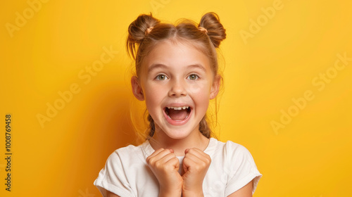 Little girl dressed in summer clothes smiling and pointing on yellow background