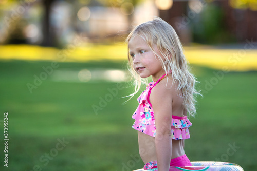 Little girl in a swimsuit standing outside.