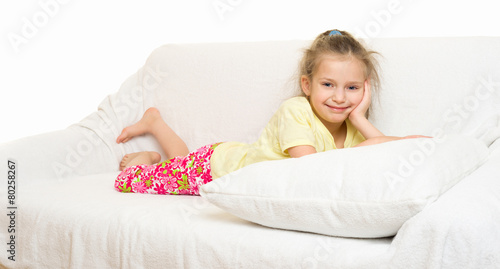girl, bed, lie, rest, lay, healthy, sleep, skin, white, good, children, children, 1, studio, caucasian, isolated, children, little, closeup, portrait, smile, adorable, teenage, young, brunette, pillow, cushion, blanket, happy, clear, clean, to rest, joy, cheerful, optimistic, play, game, fun, female, pajama, red, yellow, blue, sofa, to sit, stomach