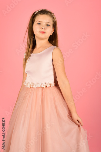 Little girl in fashionable dress, prom. little girl or kid in prom dress.