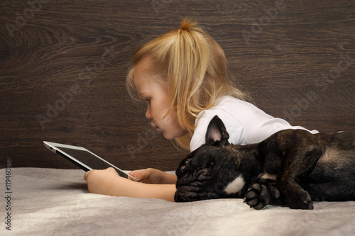 girl, baby, beautiful, computer, control, development, digital, display, early, elementary, equipment, fun, game, happiness, harmful, information, cyberspace, lack, lifestyle, man, network, panel, play, preschool, reading, recreation, relaxation, smiling, surveillance, technology, touch, wireless, dog, together, bulldog, bed, home, indoor, close, evening, comfort, bedtime