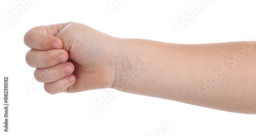 Little girl showing fist on white background, closeup