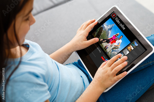 little girl watching travel videos online. Child watching a video about the trip with his family