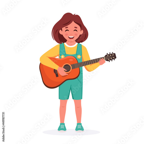 Little girl with guitar. Girl playing guitar. Child playing musical instrument. Vector illustration