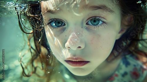 little girl, underwater, red hair, pool, closeup, childhood, underwater photography, bubble, clearwater, curious, playful, carefree, swimming pool, vacation, floating, happy child