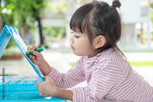 Little kids drawing with a colored pencil is a good activity for improving creative art and handwriting skills in children. Concept picture for education and learning hobby.