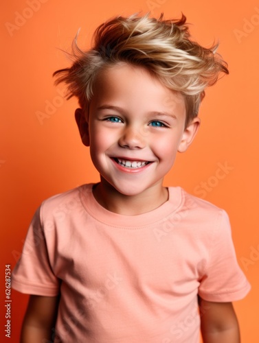 Little pretty boy smiling model posing at camera in bright studio. Generative AI