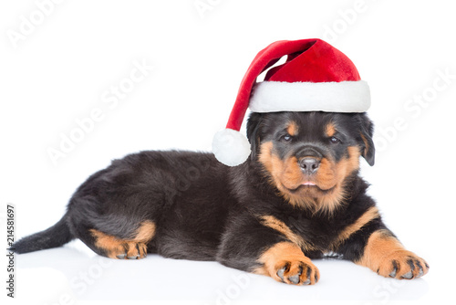 Little rottweiler puppy in red christmas hat lying with gift box. Isolated on white background