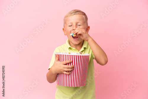 Little Russian boy eating popcorns in a big bowl over isolated background