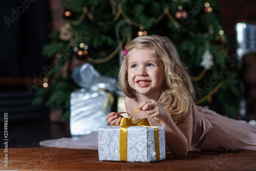Little smiling girl with Christmas gift box lying on the floor on Christmas tree background