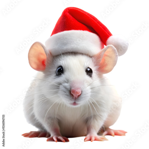 Little white mouse in a santa hat isolated on transparent background